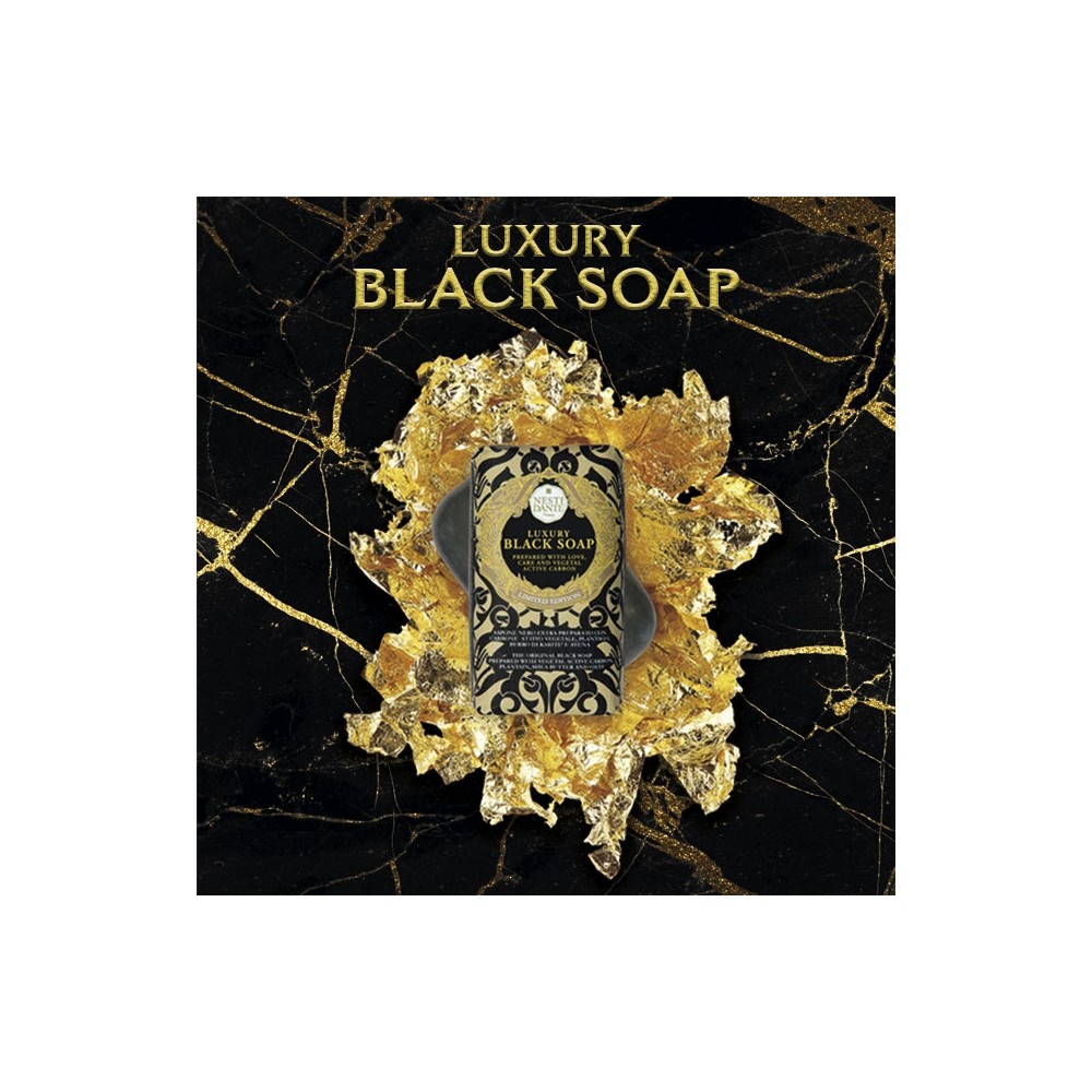 Jabón vegetal en barra de lujo enriquecido con ingredientes activos de carbón vegetal, avena y plantago. El jabón de lujo Black Soap ha sido creado siguiendo las recetas secretas que han sido manejadas a través de las generaciones. Las ricas propiedades the la ceniza de plantas cosechadas africanas y de cortezas o vainas de plátano, avena y cacao, limpian profundamente la piel mientras incrementan la circulación y fomentan la regeneración de las células sin ser tan agresivo como una exfoliación. Con ingrediente activo de Carbón vegetal (limpia y descongestiona, además de revitalizar la piel dejándola radiante con un efecto anti-edad) Manteca de karite (con propiedades emolientes, nutritivas y humectantes) Avena (con propiedades hidratantes y relajantes) y Plantago (con propiedades anti-inflamatorias y emolientes). Las propiedades hidratantes de la Manteca de karité ayudan a atenuar líneas finas. Es ideal para la limpieza diaria de pieles grasas a mixtas o manchadas. Además esta nueva formulación de belleza de ultra rendimiento está enriquecida con el estimulandte patchouli, la pimiento rosada, sensual jacinto y el fresco jasmine para lograr un inesperada explosion de opulenta fragancia.