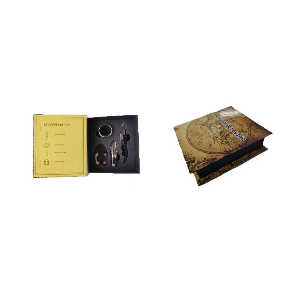 Set 4 accesorios para vino, presentado en caja tipo libro