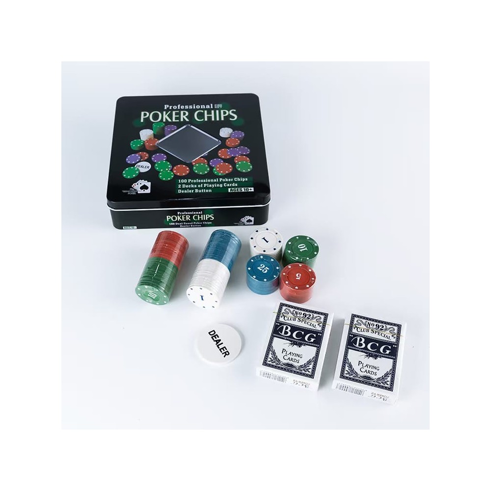 set de poker con 100 fichas, para jugar horas y horas en familia o amigos en la comodidad del hogar simulando la fantasía de jugar en un casino.